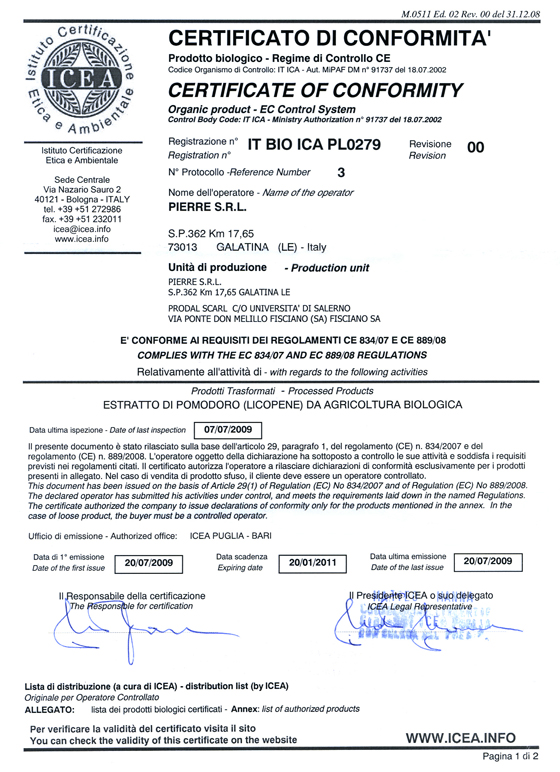 ORGANIC CERTIFICATION OF LYCOPENE PRODUCTS - PIERRE SRL ITALY - WORLD INTELLECTUAL PROPERTY |
