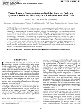 SCIENTIFIC RESEARCH Effect of Lycopene Supplementation on Oxidative Stress: An Exploratory Systematic Review and Meta-Analysis of Randomized Controlled Trials Jinyao Chen, Yang Song, and Lishi Zhang Department of Nutrition and Food Hygiene, West China School of Public Health, Sichuan University, Chengdu, China |